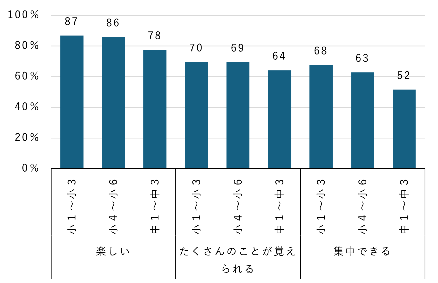 一方、図3は、学習の効果を感じている項目のうち、学年が上がるにつれて「そう感じている」と回答する割合が減少する項目を示しています。中でも減少幅が大きいのは「集中できる」です。このことから、学習への「没頭感」に関する項目は、学年が上がるにつれて実感されにくくなっていることがうかがえます。