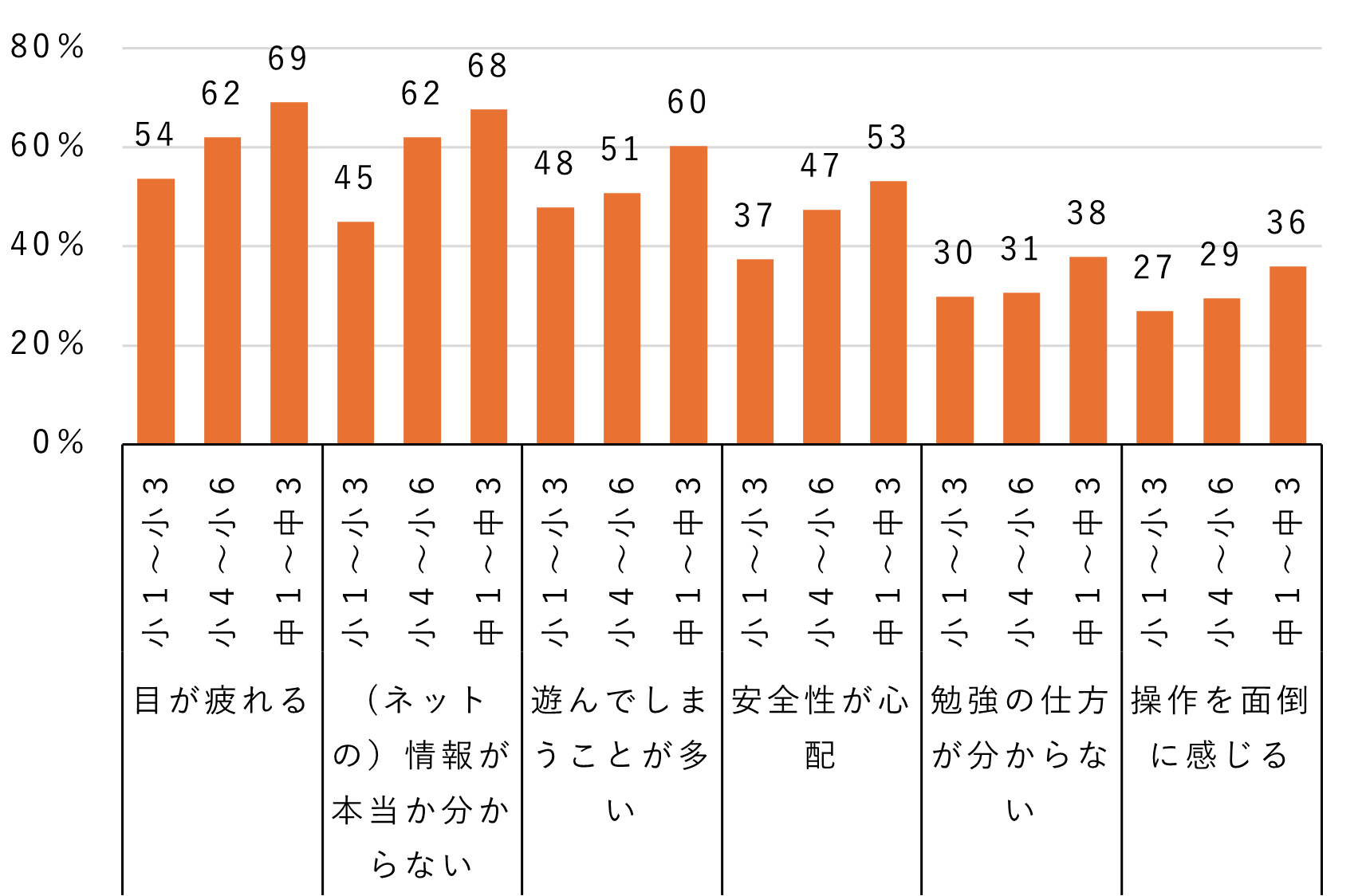 以上より、学年が上がるにつれて情報機器の利用に慣れ、活用の幅も広がることで、学習内容の理解や深化をより強く実感する一方で、情報の信頼性や安全性などに対する不安や戸惑いを感じる児童・生徒も増えていることが示唆されます。