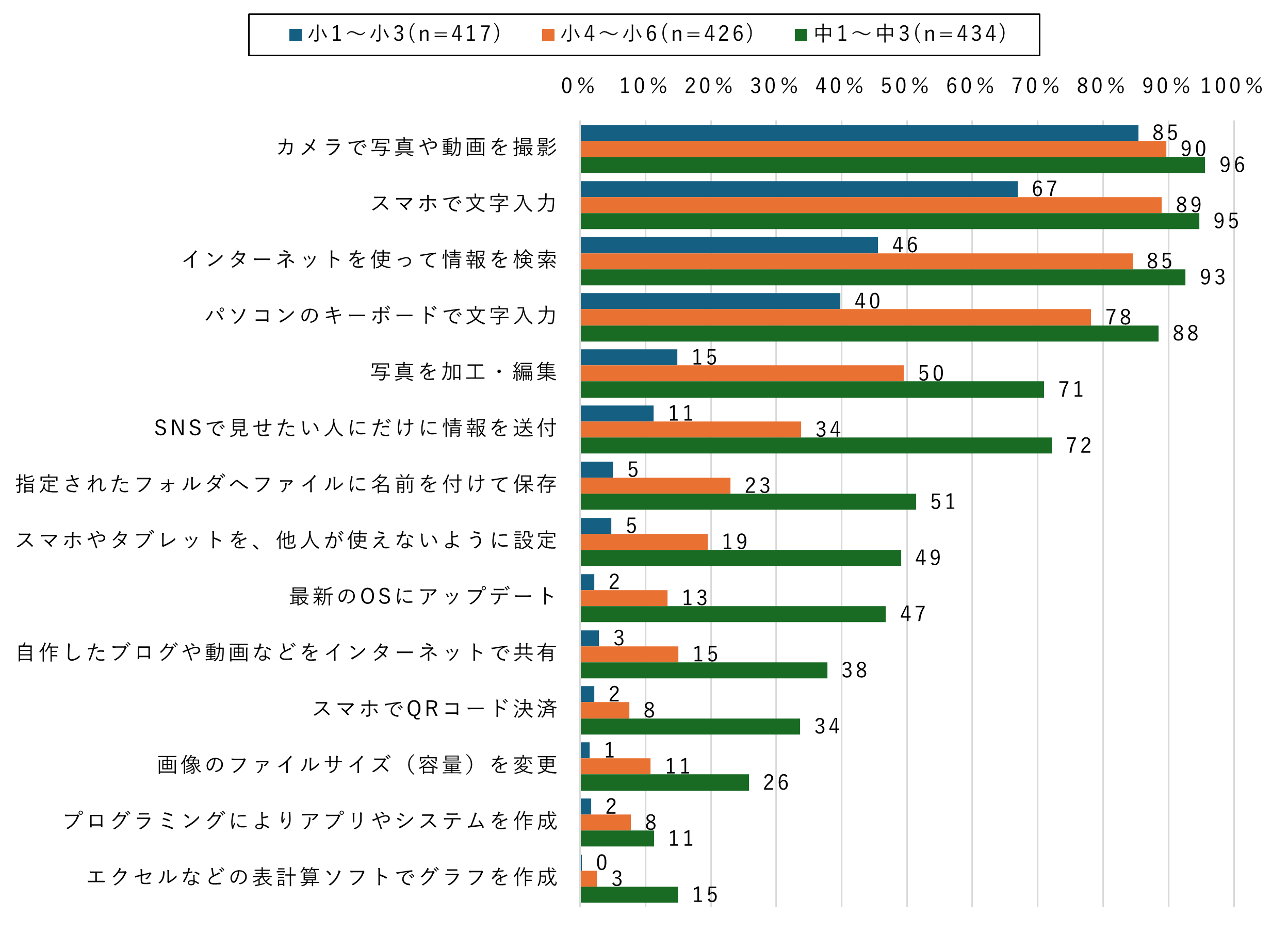 1. カメラで撮影・スマホ、パソコンで文字入力、情報検索は中学生の約9割が習得