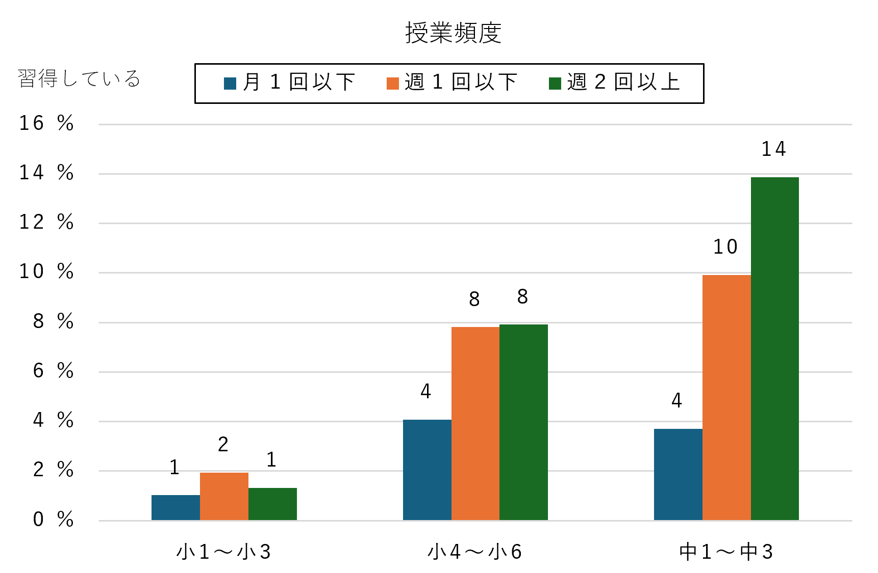 最後に、学校の授業で情報機器(タブレットやパソコン)を利用した頻度と、パソコンで文字入力ができる子どもの割合を合わせて示した結果が図4です。授業での利用頻度が高いほど、文字入力を習得している割合も高くなる傾向があります。特にこの傾向が顕著なのは、小学校低学年でした。