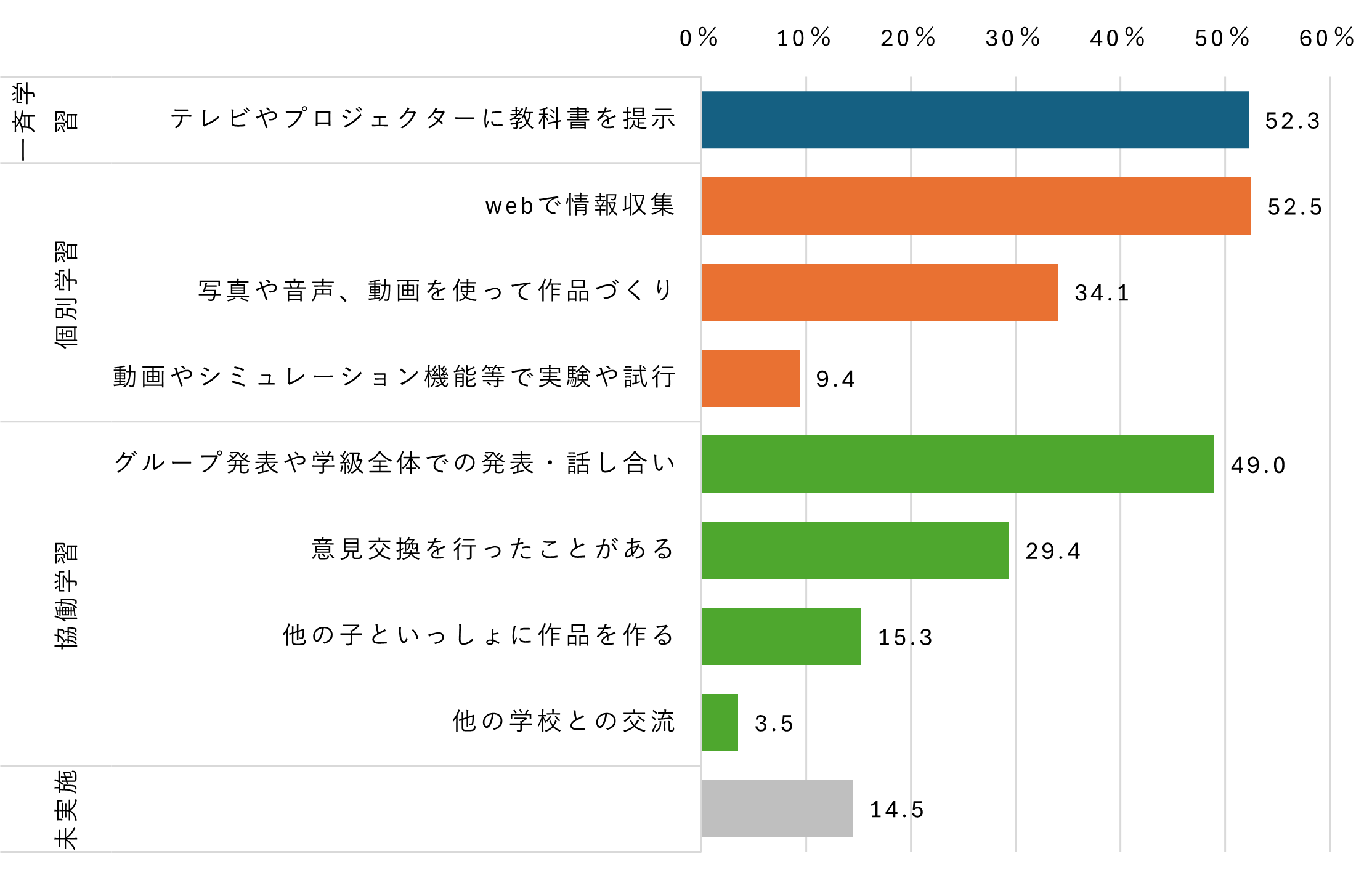 - 協働学習:こちらも約半数の児童・生徒が「発表・話し合い」を実施しています。