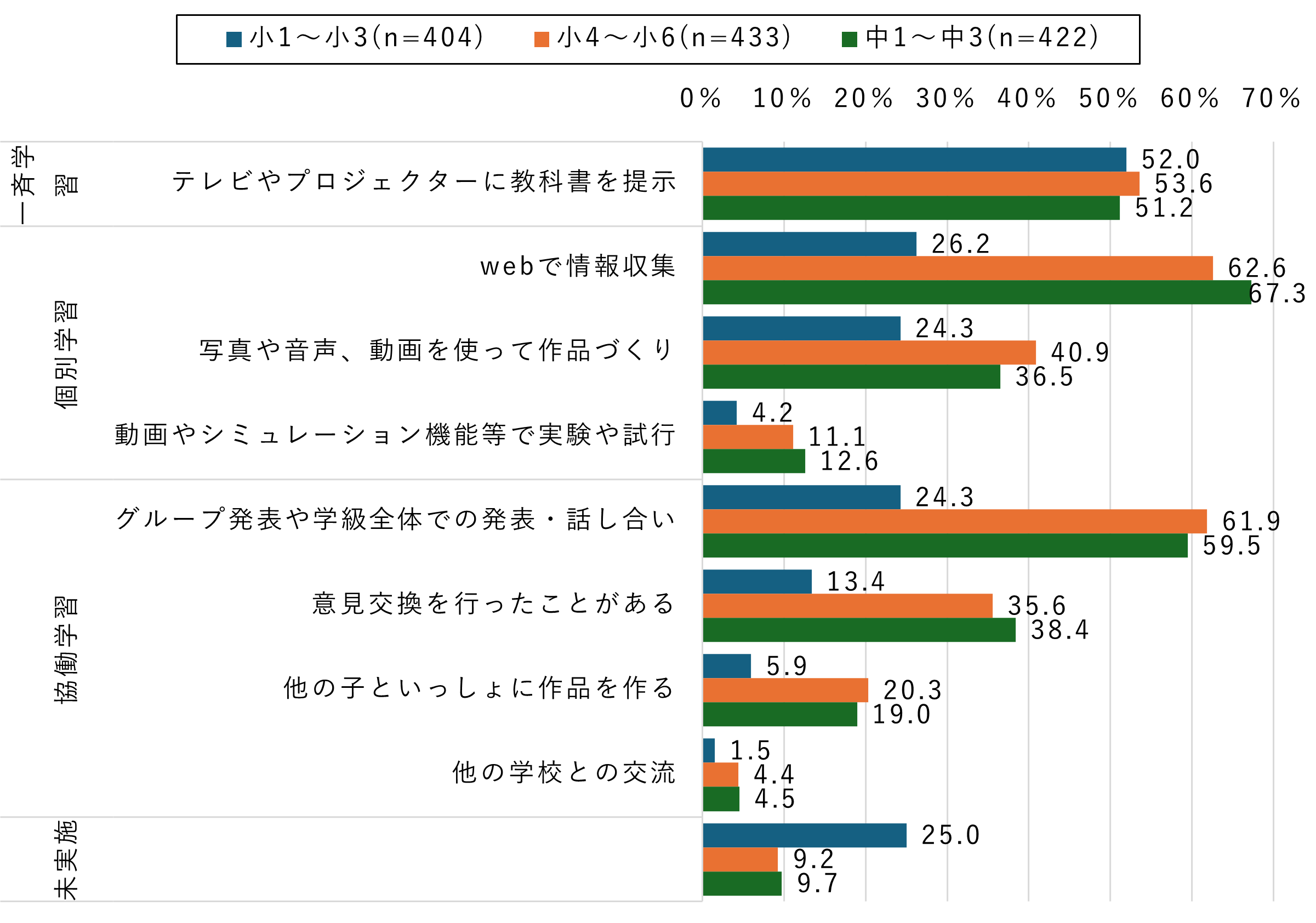 一方、個別学習や協働学習に関連する項目については、小学生高学年と中学生で同程度の活用が見られ、小学生低学年よりも高い水準となっています。