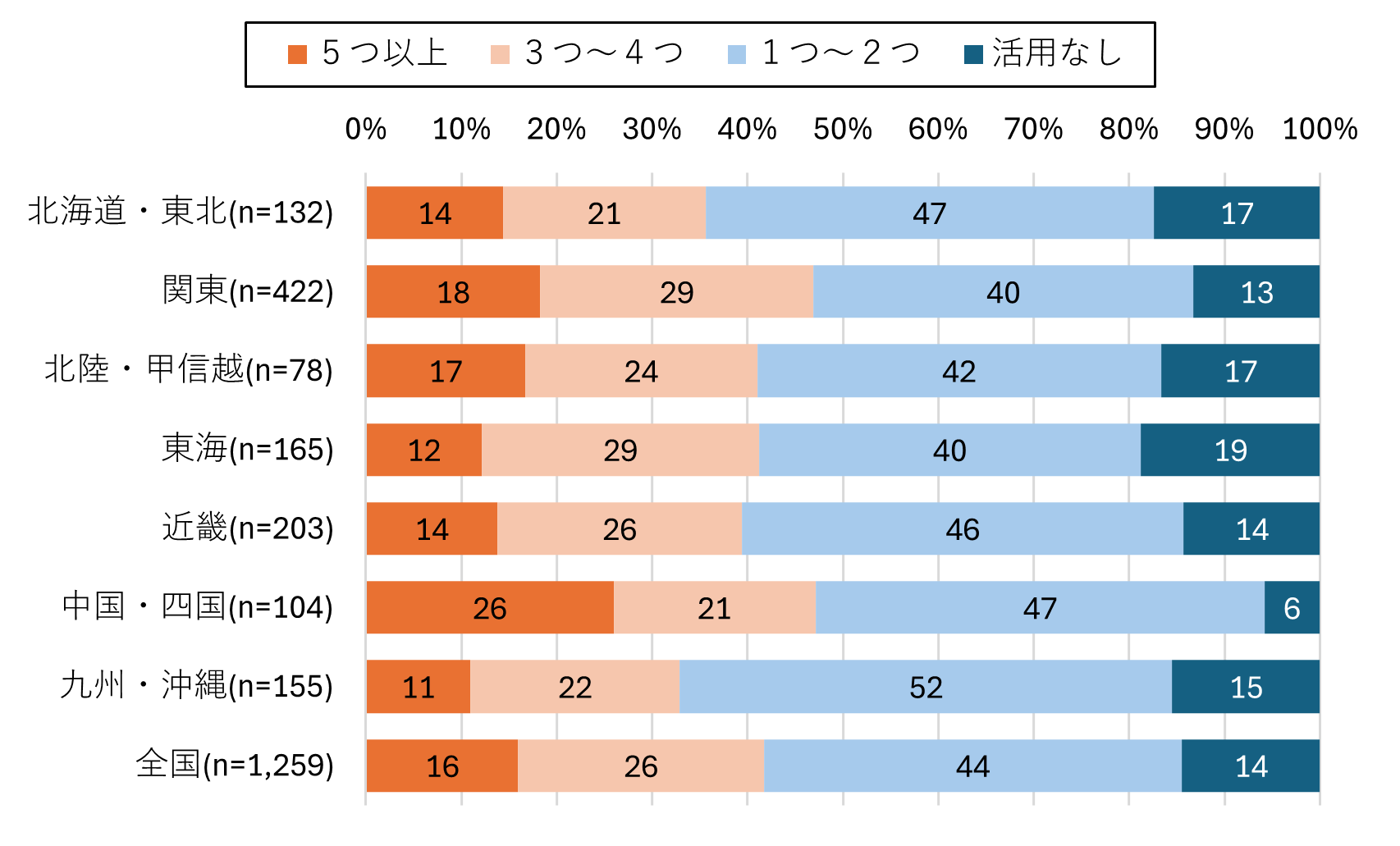 提示した8つの項目に対して、いくつ活用されているか、学年ごとに集計しました。平均すると、小学生低学年は1.5個、高学年と中学生が2.9個でした。活用されている個数の分布を図3で示しています。全体では「全て活用していない」と、「5つ以上活用している」が、同水準の約15%でした。活用状況は学校・クラスによって、差があることが確認できます。地域別の状況については、参考情報をご覧ください。
