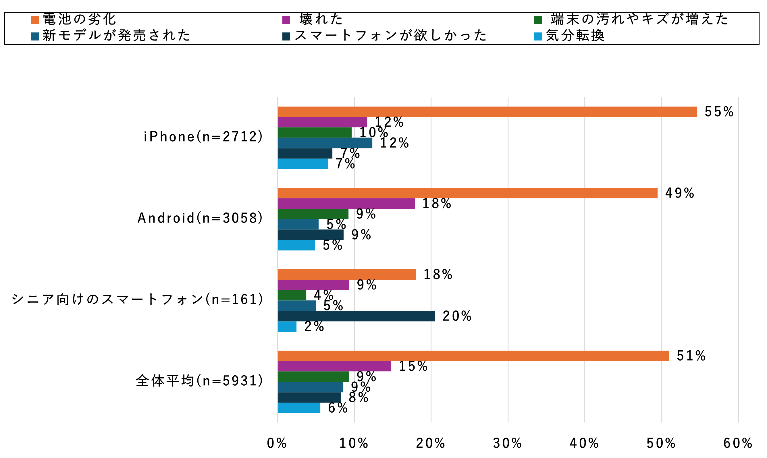 新機種の購入きっかけについて利用機種別に調べたところ、「電池の劣化」がiPhoneは55%、Androidは49%と約5割となっており、ともに最も高いきっかけとなっていました。また、iPhoneでは、「新モデルが発売された」が12%と、Andoid5%と比べて7ポイント高い購入きっかけとなっていました。シニア向けのスマートフォンでは「スマートフォンが欲しかった」「電池の劣化」の順となっていました。シニアのスマートフォン所有きっかけについては、2023年5月のレポートで詳しく説明していますので、こちらもご参照ください。