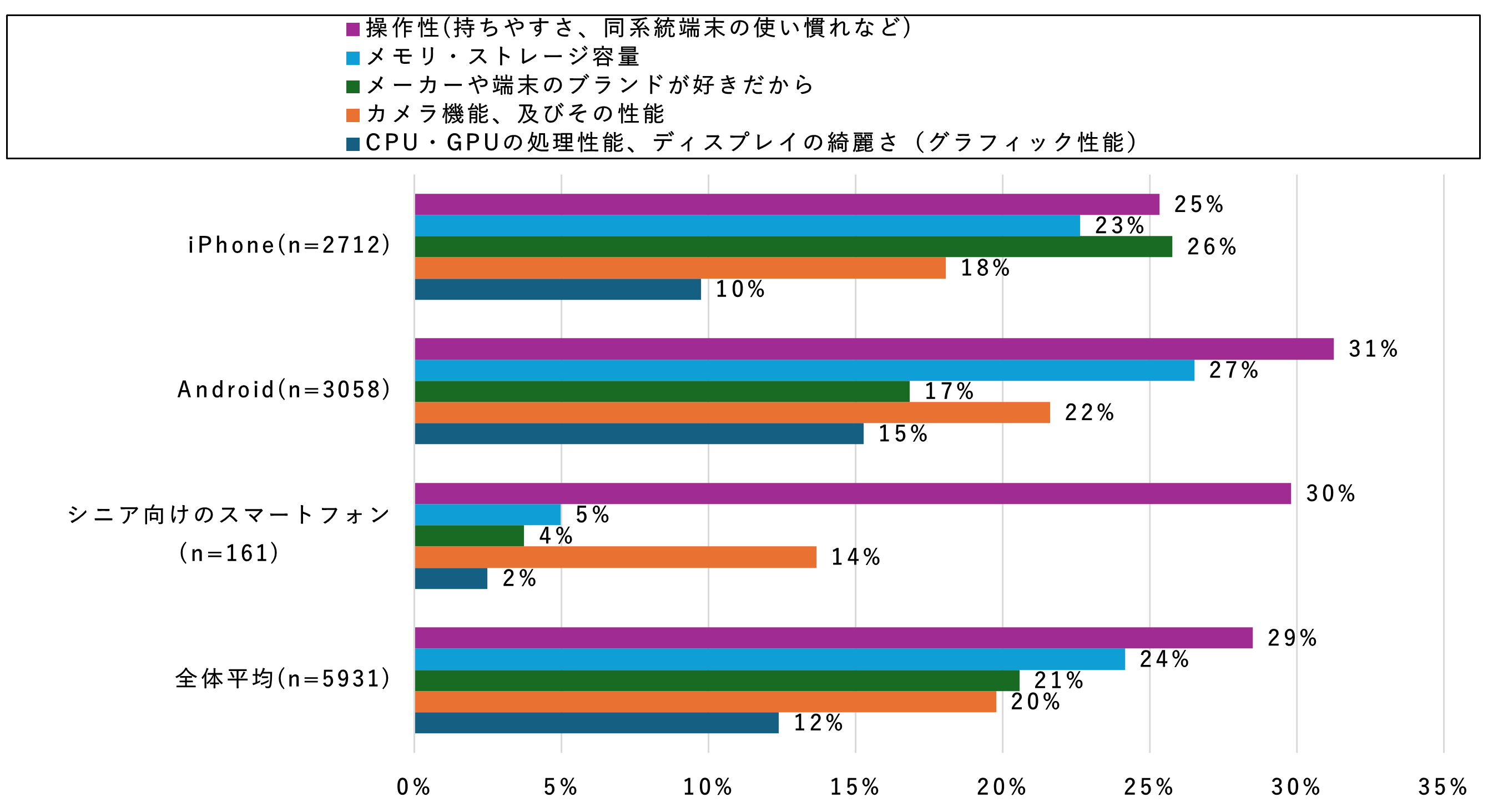 次に、購入時に重視することについて、利用機種別で見た結果が図3となります。「操作性(持ちやすさ、同系統端末の使い慣れなど)」は、全種別で高い結果となりましたが、iPhoneでは「メーカーや端末のブランドが好きだから」が26%となり、「操作性」と比較して僅差ながらも最も高い重視ポイントとなっており、Androidと比較して9ポイント高くなっていました。一方、Androidでは「操作性」、「メモリ・ストレージ容量」、「カメラ機能」、「グラフィック性能」など、機能面の重視が高い結果となっていました。