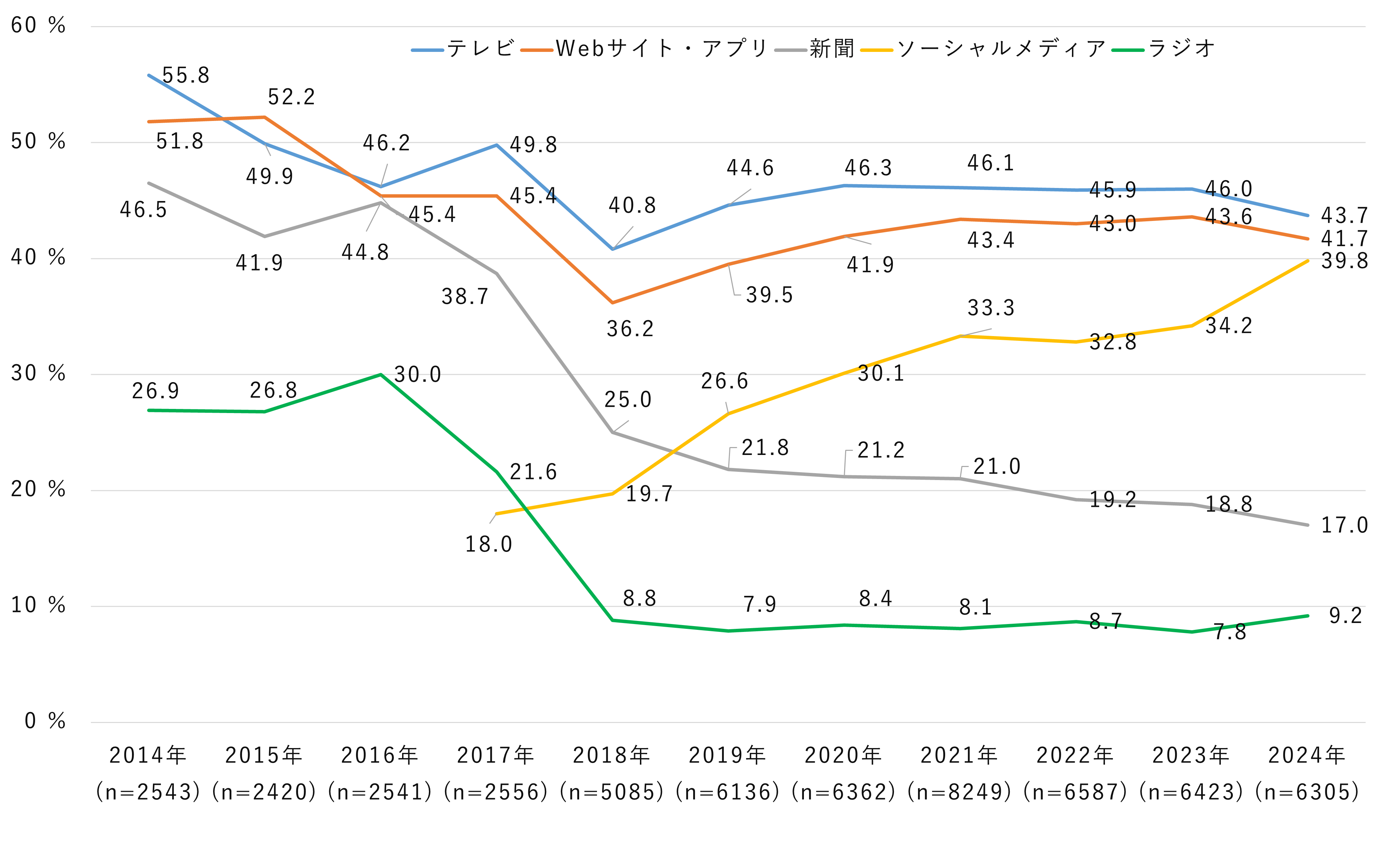 図1. 生活情報(趣味やお買い得情報など)を得ているメディア利用率の推移(2014年~2024年)