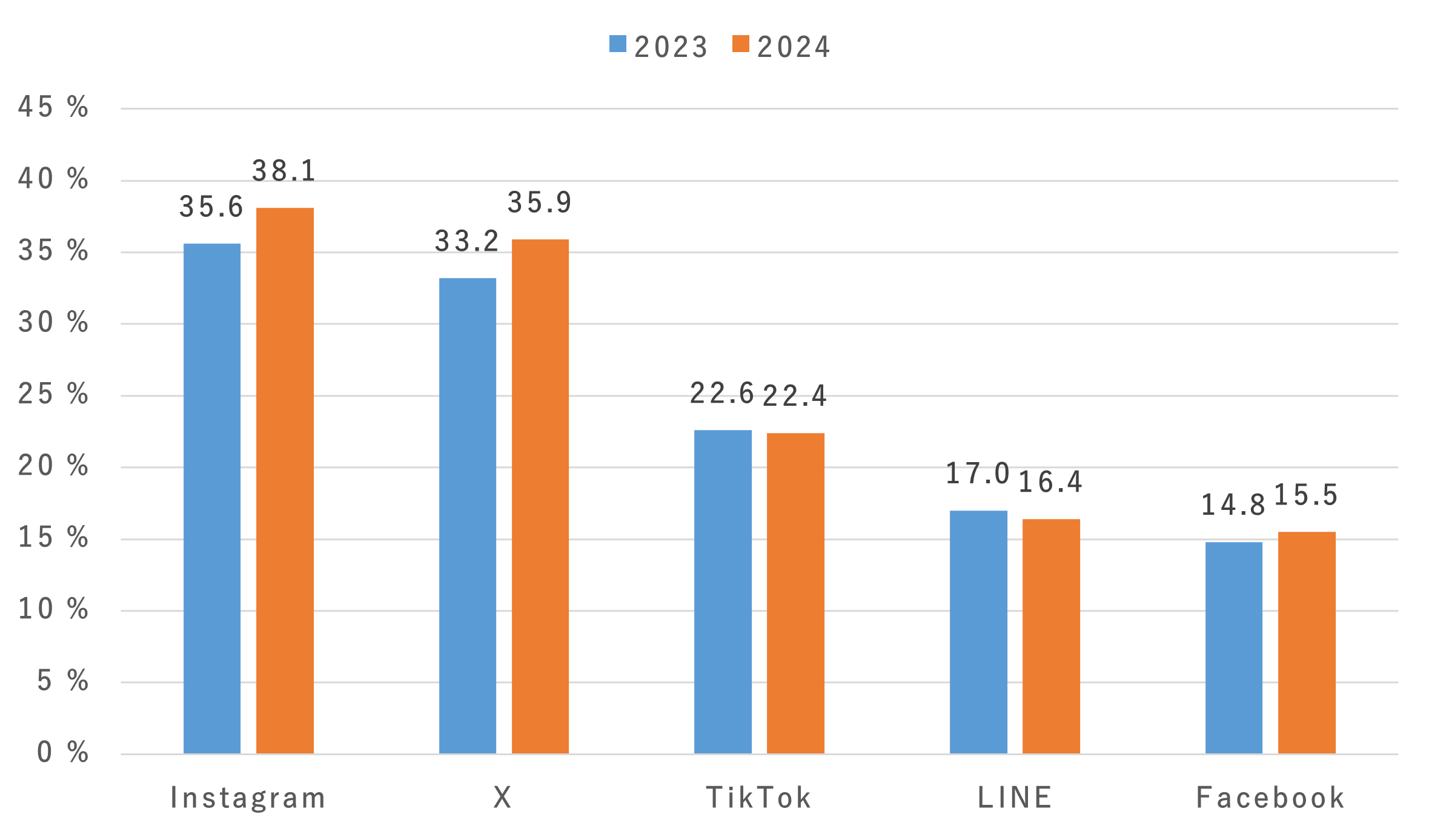 (n(2023年/2024年)=Instagram(2546/2655) X(2775/2746) TikTok(672/1134) LINE(5374/5350) Facebook(1586/1372)