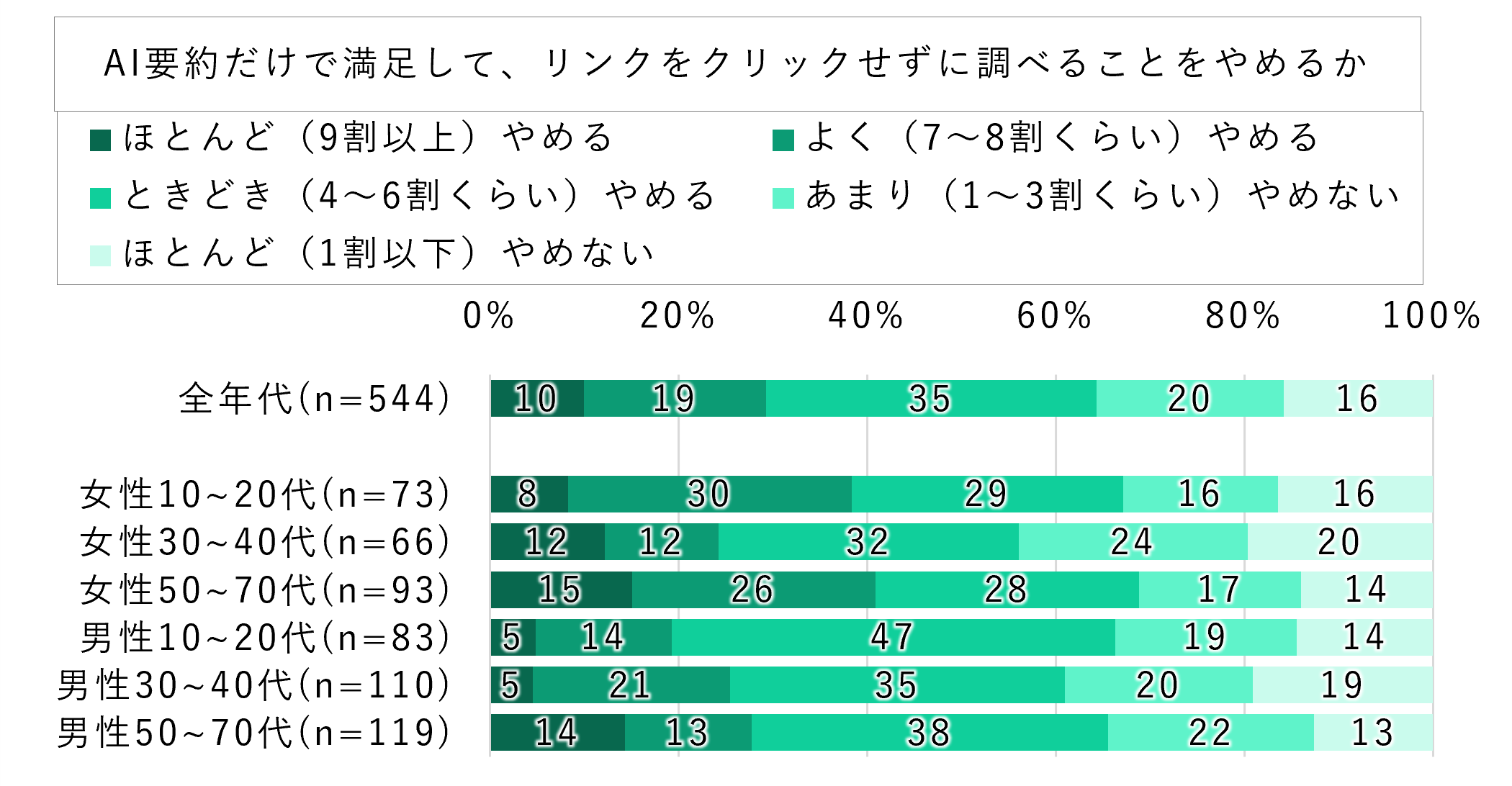 その結果、「ほとんどやめる」が10%、「よくやめる」が19%、「ときどきやめる」が35%となり、合計64%の生成AI利用者が要約のみで満足し、リンクを開かないゼロクリック検索を行っている傾向が示されました。