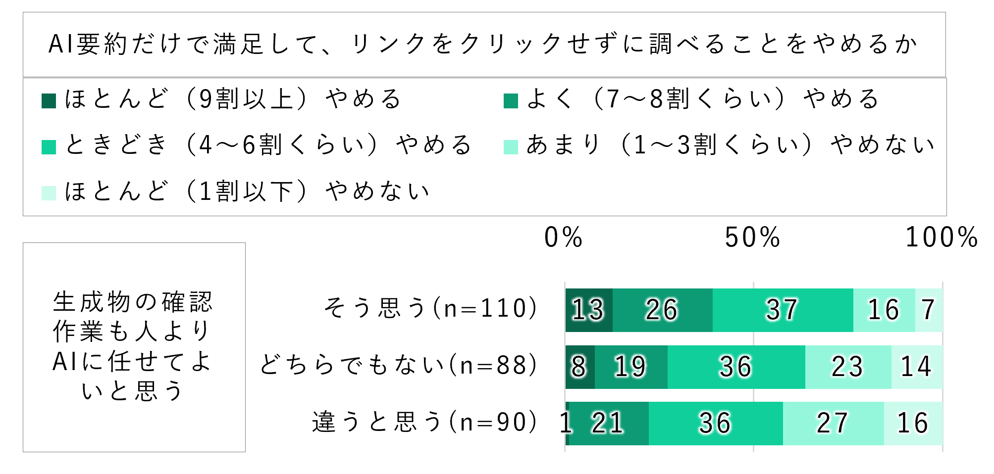 それでは、AI生成情報に対する意識によって、ゼロクリック検索の実施率は変化するのでしょうか。集計の結果、「生成AIで作成したテキストを宿題や仕事で提出する際、生成物の確認作業も人よりAIに任せてよい」と考える人ほど、ゼロクリック検索を実施している傾向が見られました(図2-1)。
