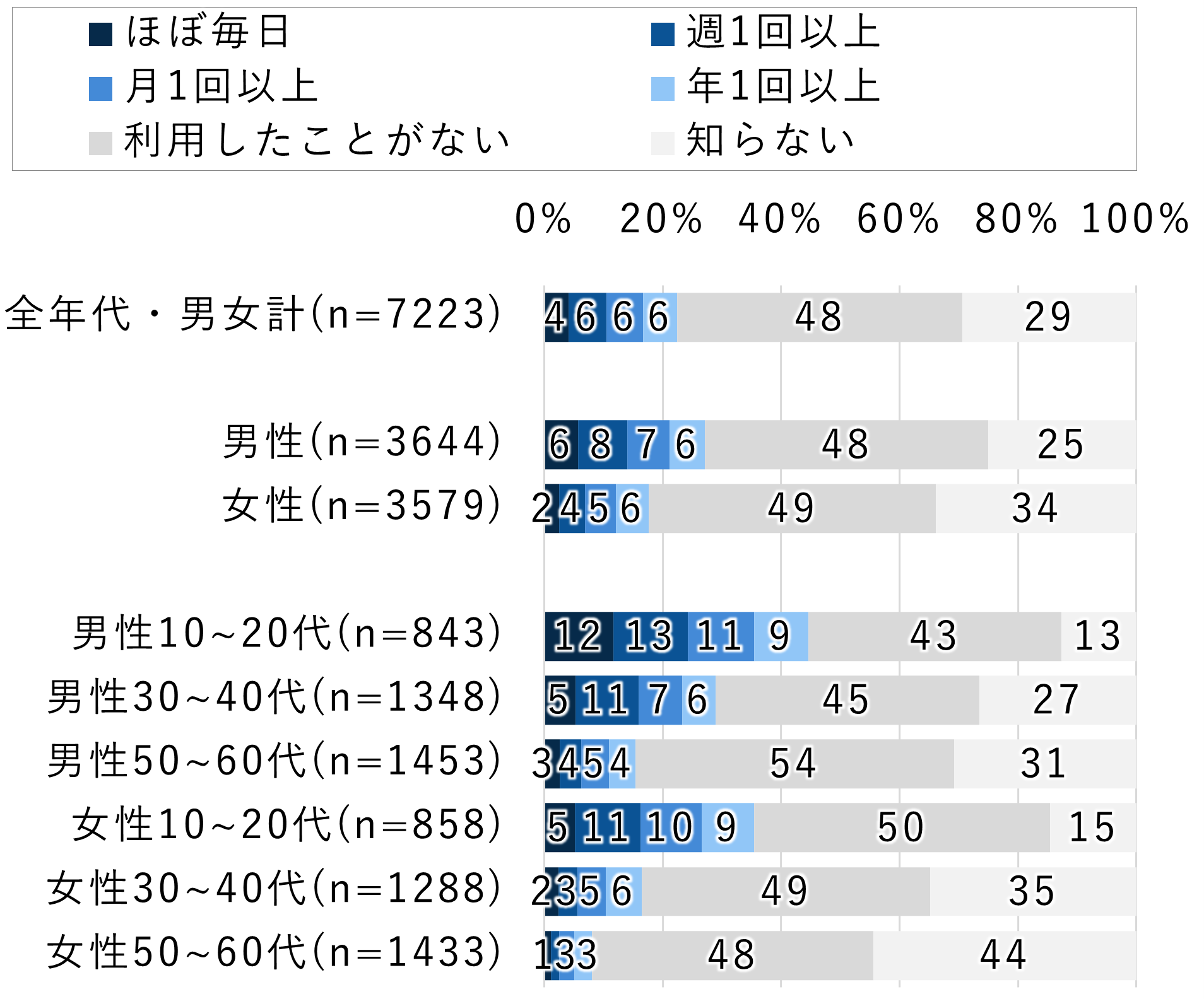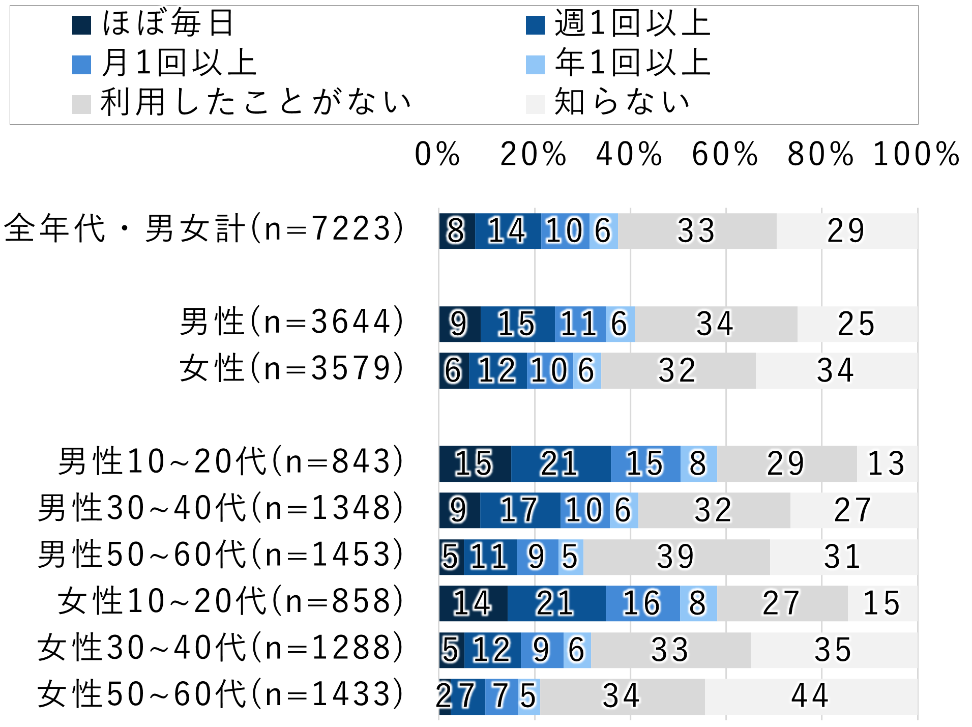 その結果、プライベートでの対話・相談では、「ほぼ毎日」「週1回以上」を合わせた割合が22%を占めており、特に若年層で利用頻度が高い傾向が見られました(図2-1)。