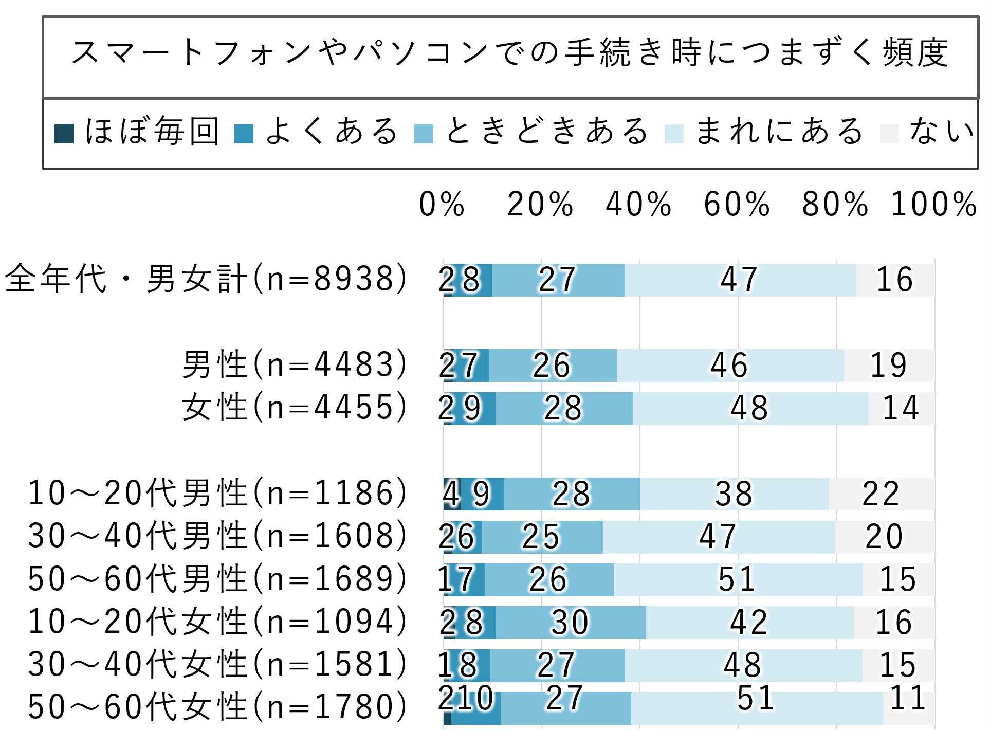 1. 8割以上がスマートフォン・パソコンでの手続き時につまずきを経験、手続き頻度が多いほどつまずきも多い傾向