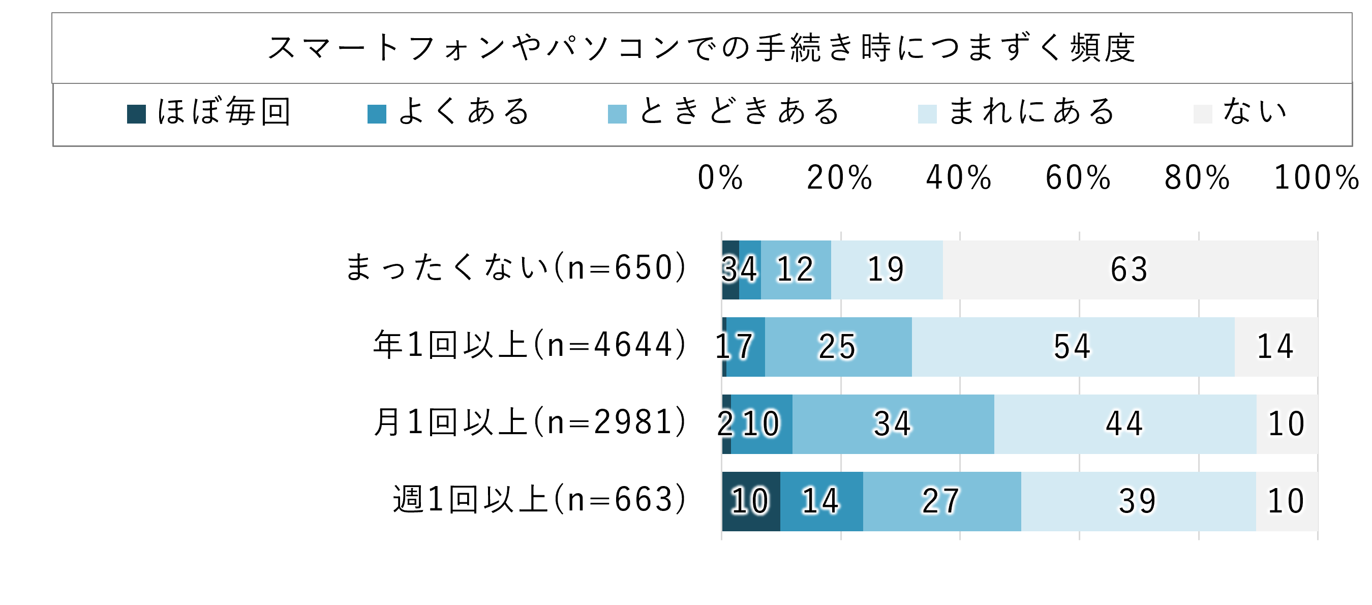 つまずく頻度については、性年代別では顕著な差は見られませんでした。一方で「スマートフォンやパソコンで手続きをする頻度別」に集計すると、手続き頻度が多い人ほど、つまずく頻度も多い傾向がみられました(図1-2)。