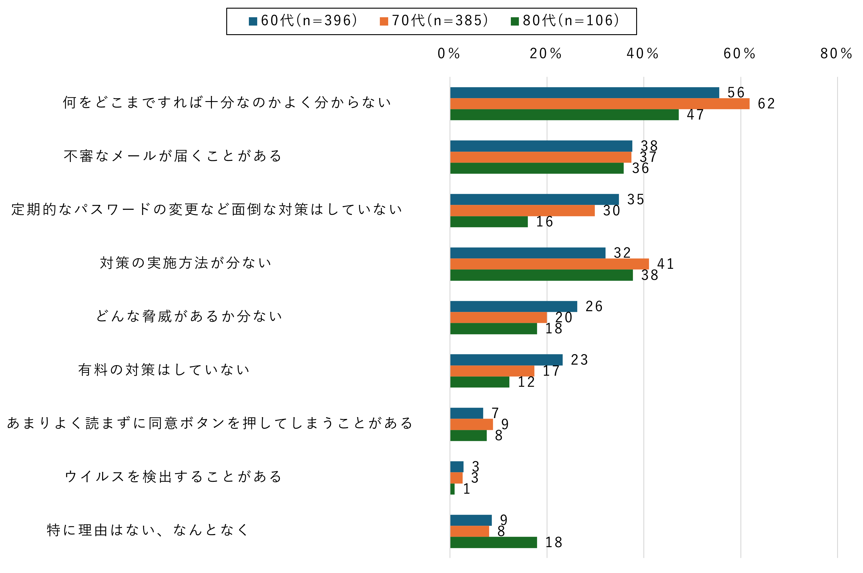 セキュリティ対策が十分できていないと回答した人を対象に、何故そう思うか、調査しました。その結果、半数のシニアが「何をどこまですれば十分なのかよくわからない」と回答しました。それ以外にも、「不審なメールが届くことがある」「面倒な対策はしていない」「対策方法が分からない」が上位となりました。