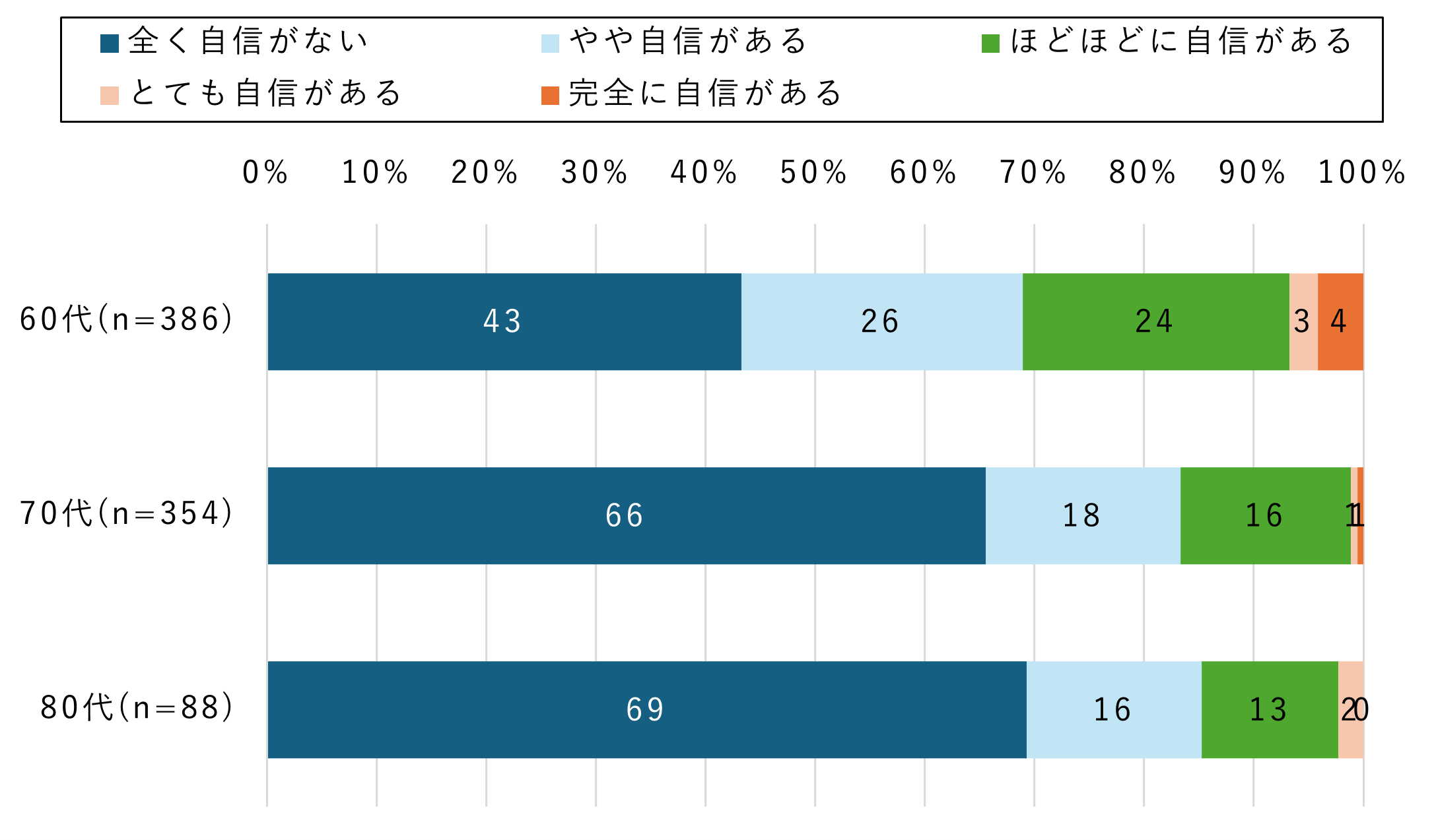 最後に「新たにセキュリティ対策が必要となった場合」、現在のスマホ利用を継続できる自信があるか、調査したところ、70~80代の約7割が「全く自信がない」と答えました。