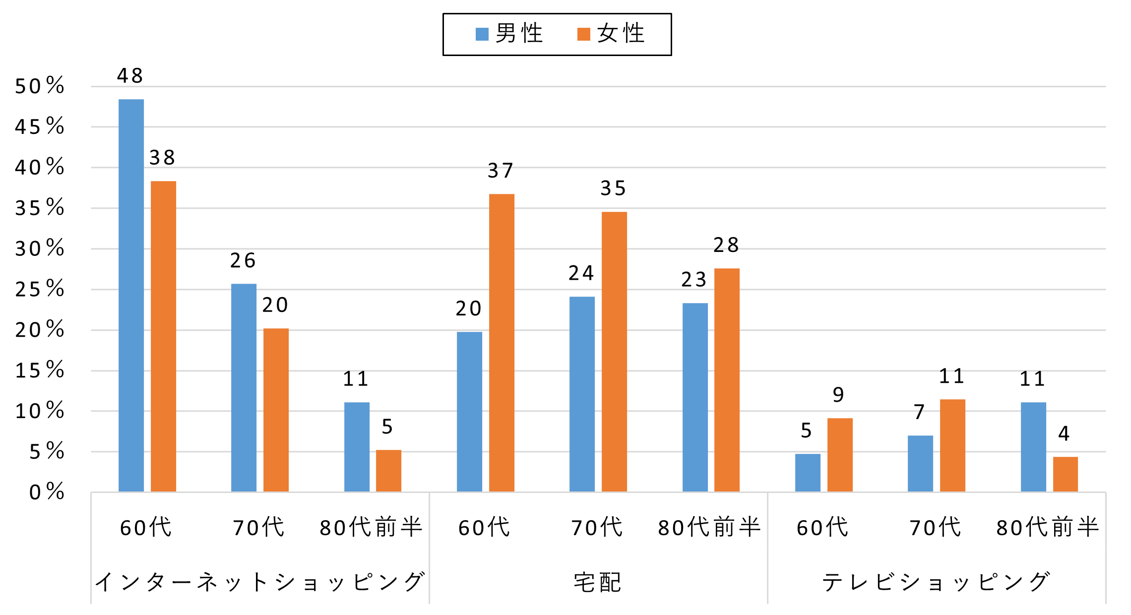 テレビショッピングは、年代差が大きく、同年代の中ではやや男性の利用率が高いです。宅配は女性の利用率が高い傾向です。