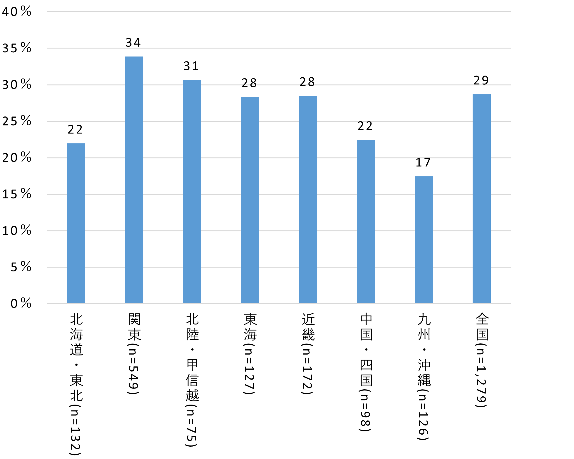 次に地域別にインターネットショッピングの利用率をみます。関東が最も高く、3人に1人が利用しています。最も低い、九州・沖縄との差は、17ポイントあります。