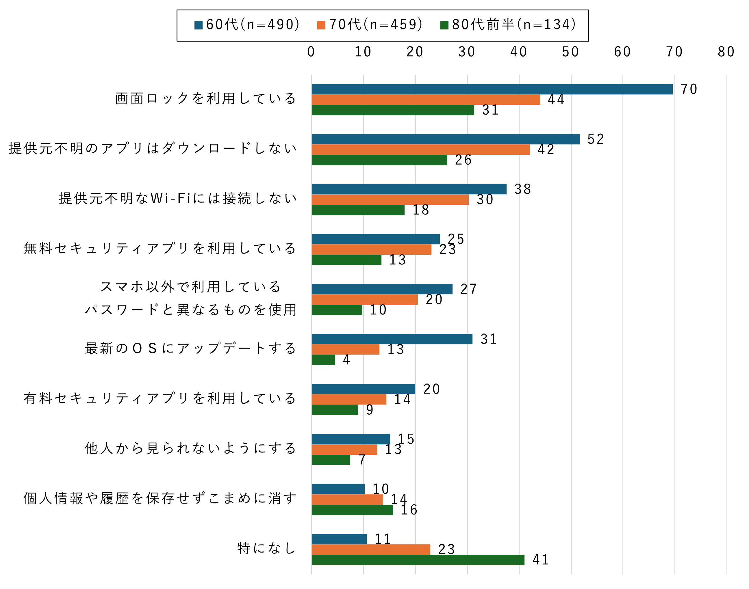 図1の通り、スマホに関するセキュリティ対策は、年齢が低い方が多数行っています。画面ロックは60代で7割が利用しています。その一方、80代前半の約4割は何も対策をしていませんでした。