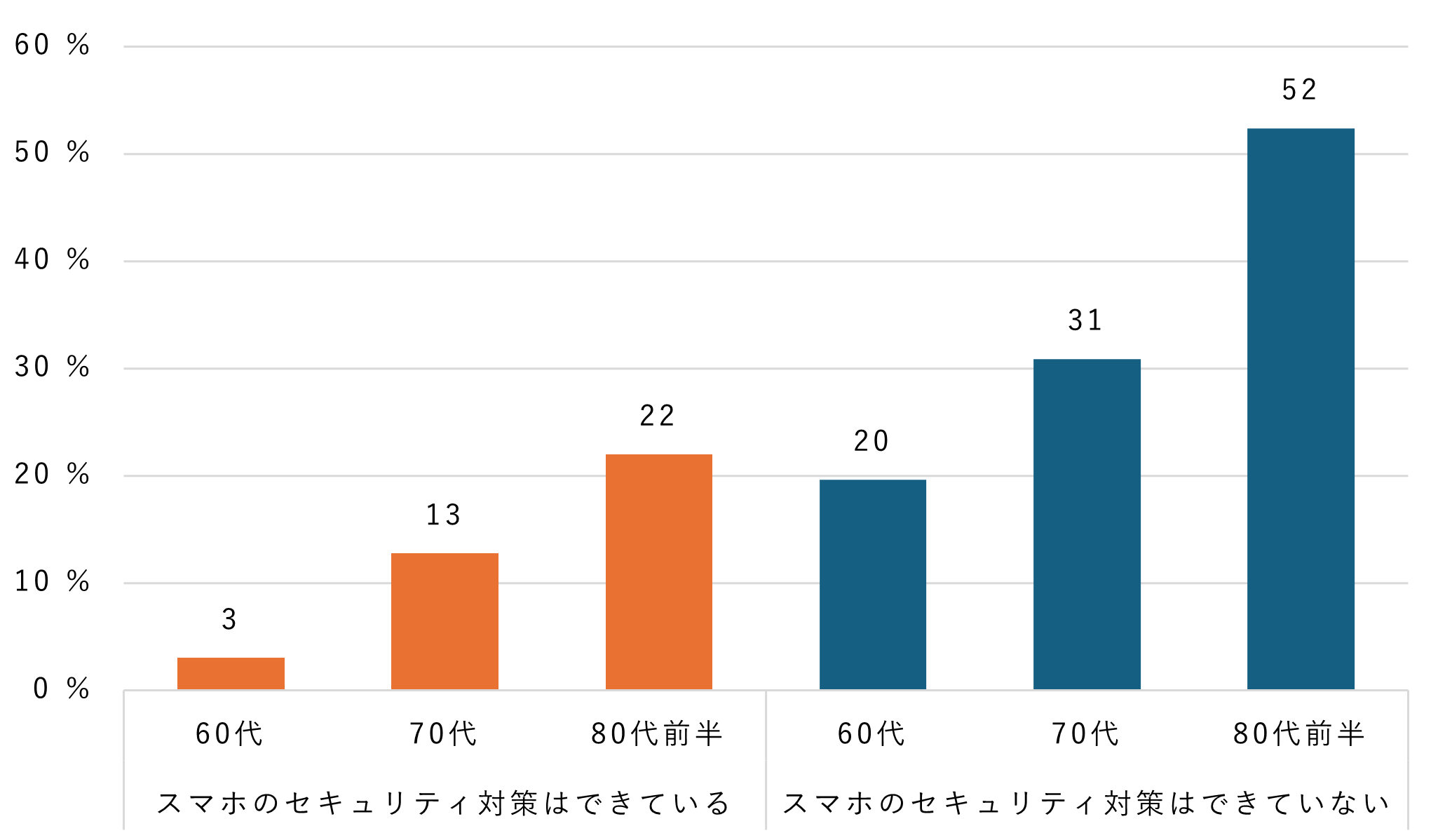 最後にスマホのセキュリティ対策をできている・できていないに分けて、セキュリティ対策を何もやっていない割合を算出しました。その結果、できていると答えた人の中でも、70代で13%、80代前半は22%のシニアが何もセキュリティ対策を行っていませんでした。