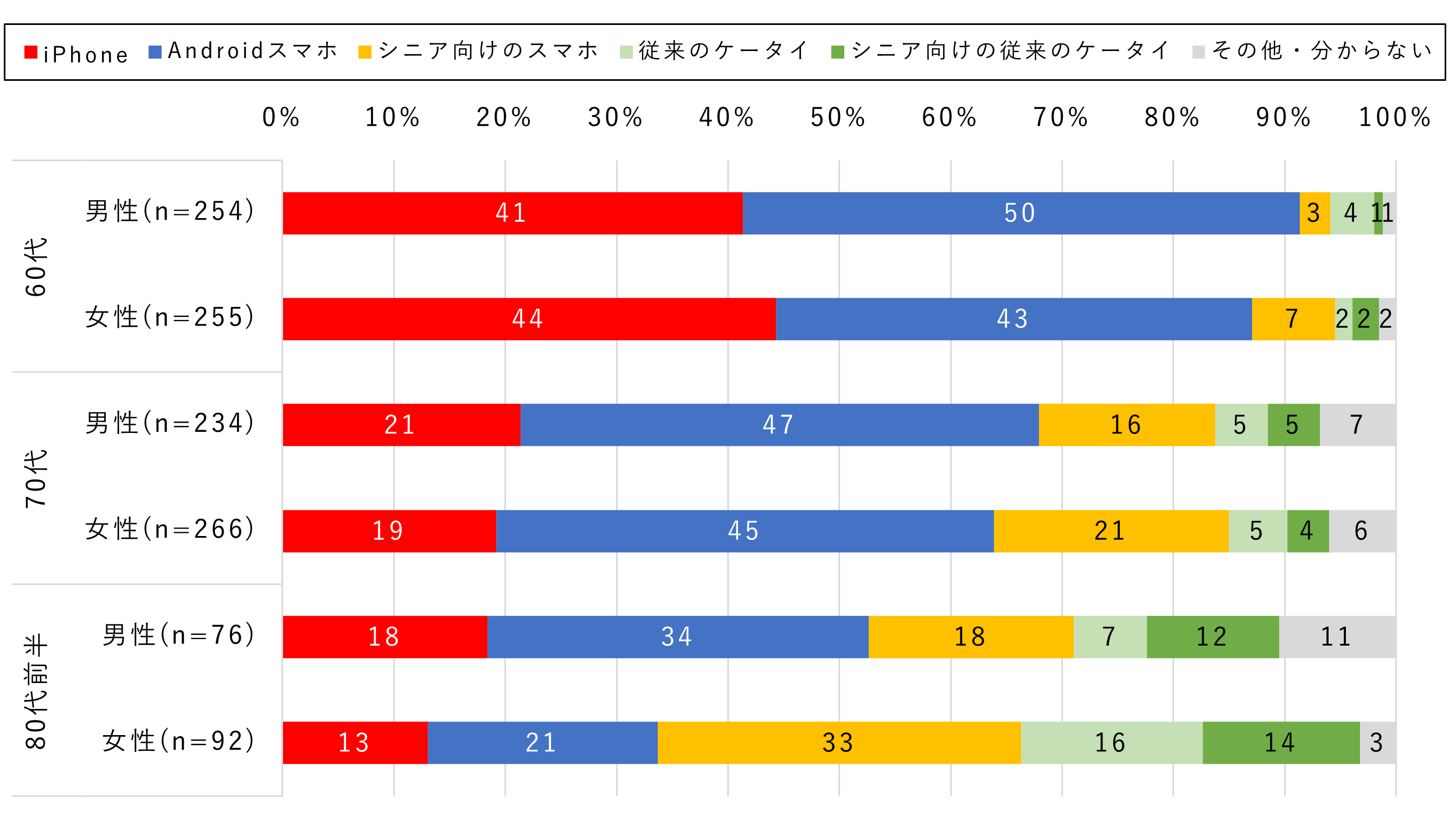また、女性は「シニア向けのスマホ」の割合が多く、男性は「Androidスマホ」が多い傾向でした。