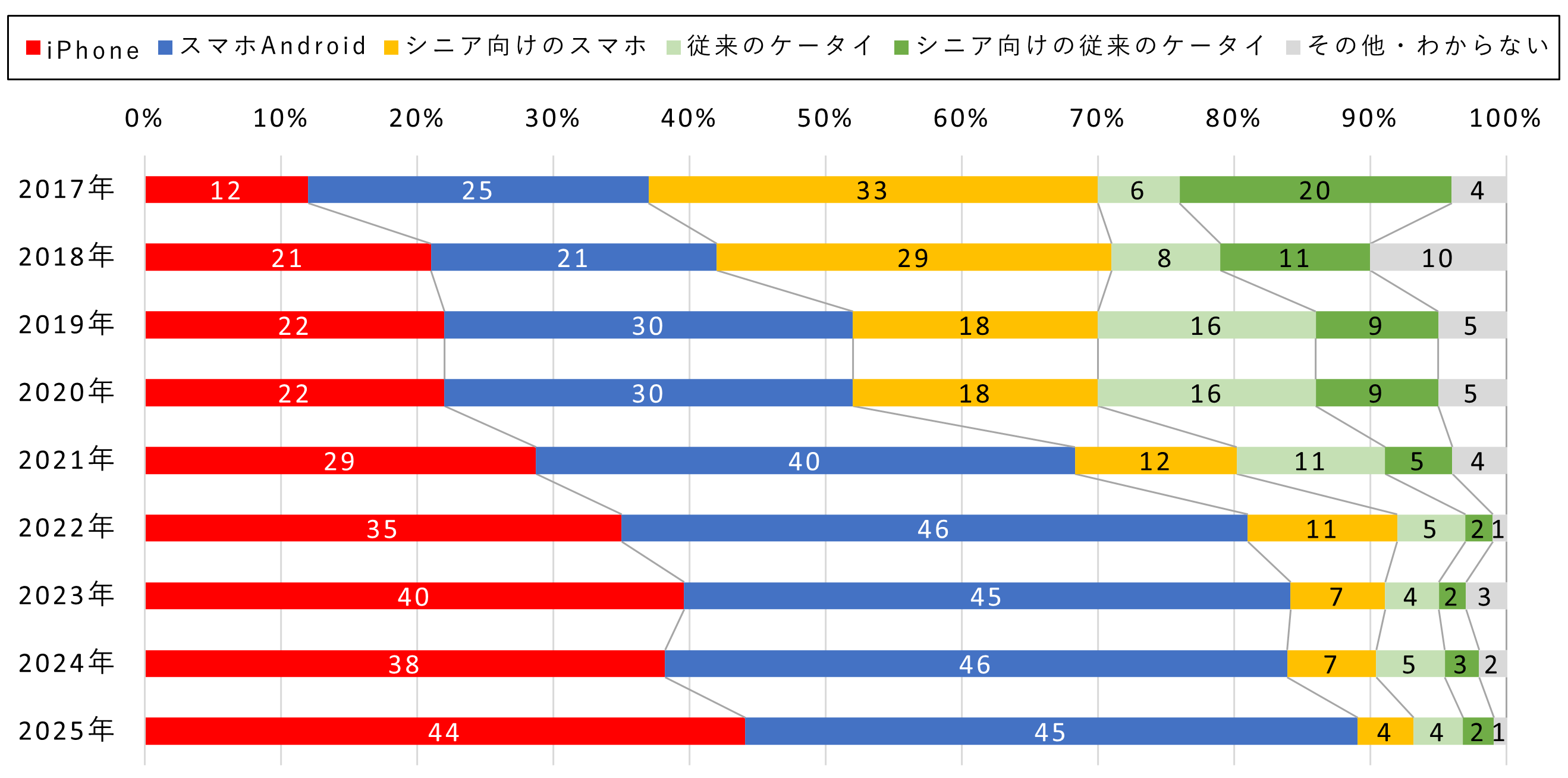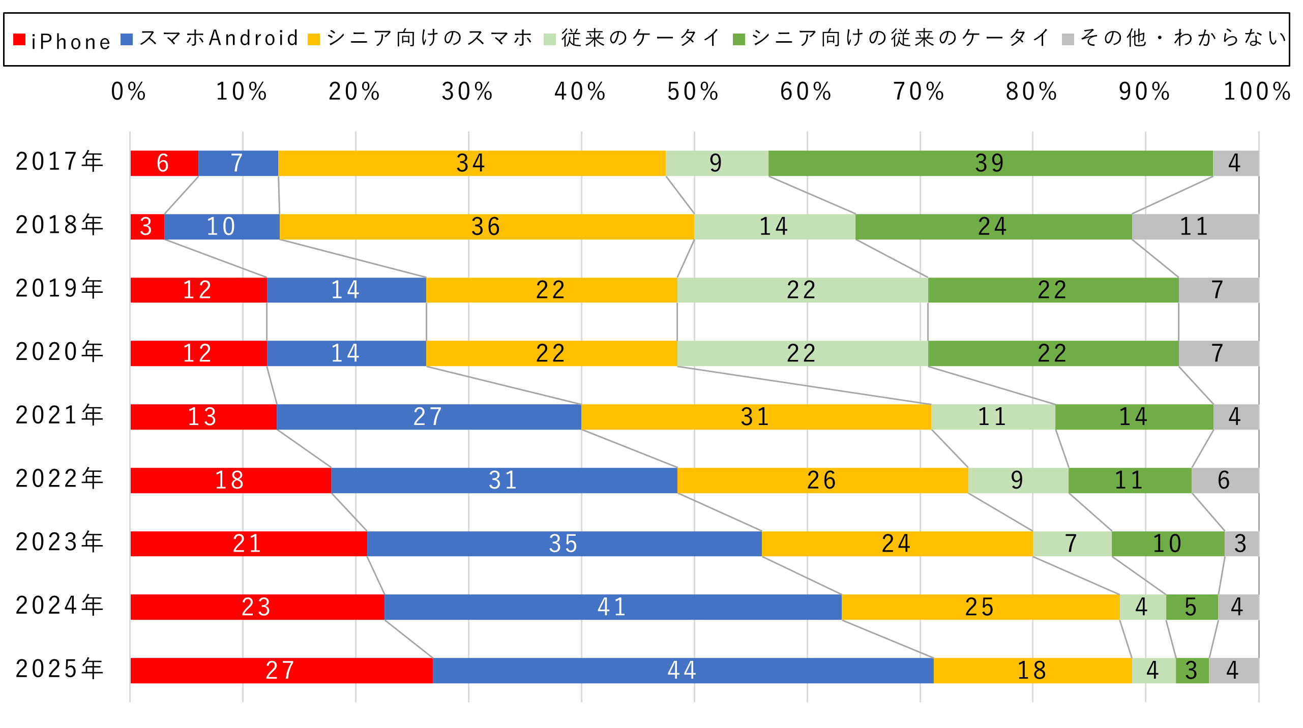2. 70代「シニア向けスマホ」の減少、「Androidスマホ」「iPhone」の増加傾向が続く
