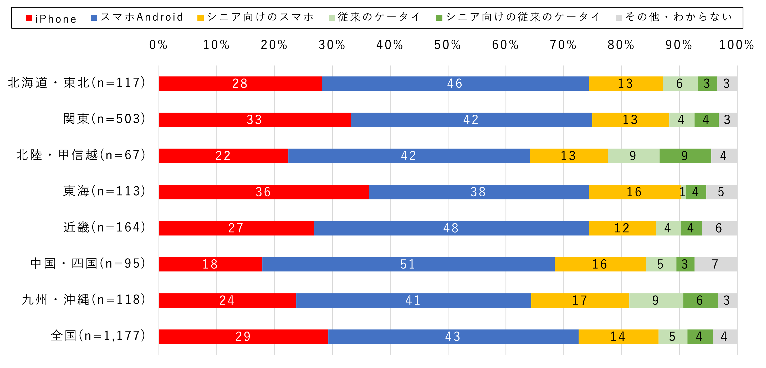 最後に地域別を見ます。スマホ(シニア向けスマホ・Androidスマホ・iPhone)比率が最も高いのは東海地区で、9割を超えています。特にiPhone比率が高いのが特徴です。