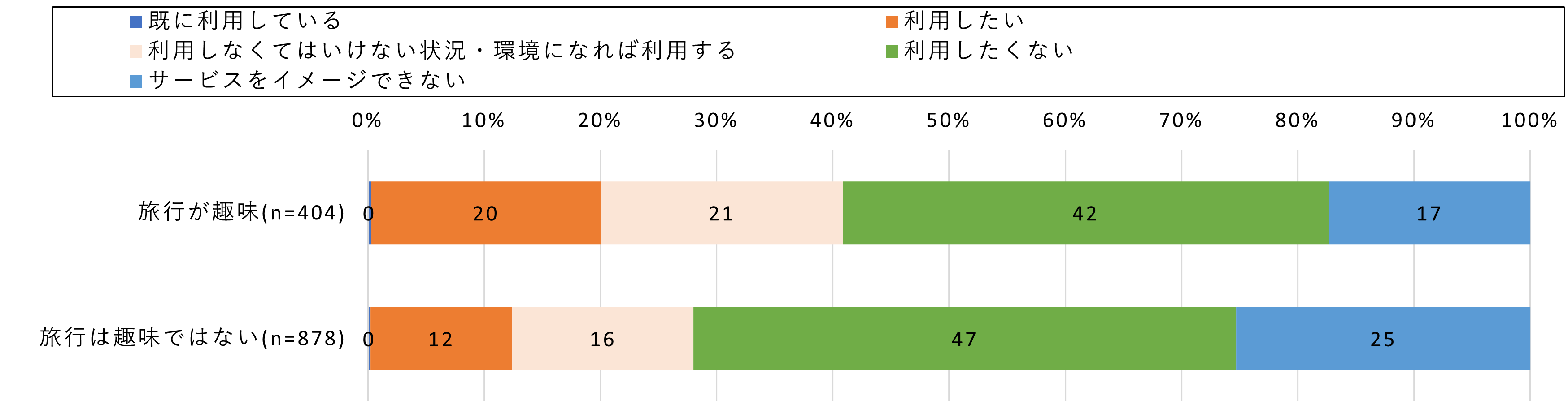 一方で、旅行を趣味としていない高齢者でも約10%が「VR旅行を利用したい」と答えています。これは、新しい技術の登場によって、これまで興味のなかった分野への関心が広がる可能性を示しています。