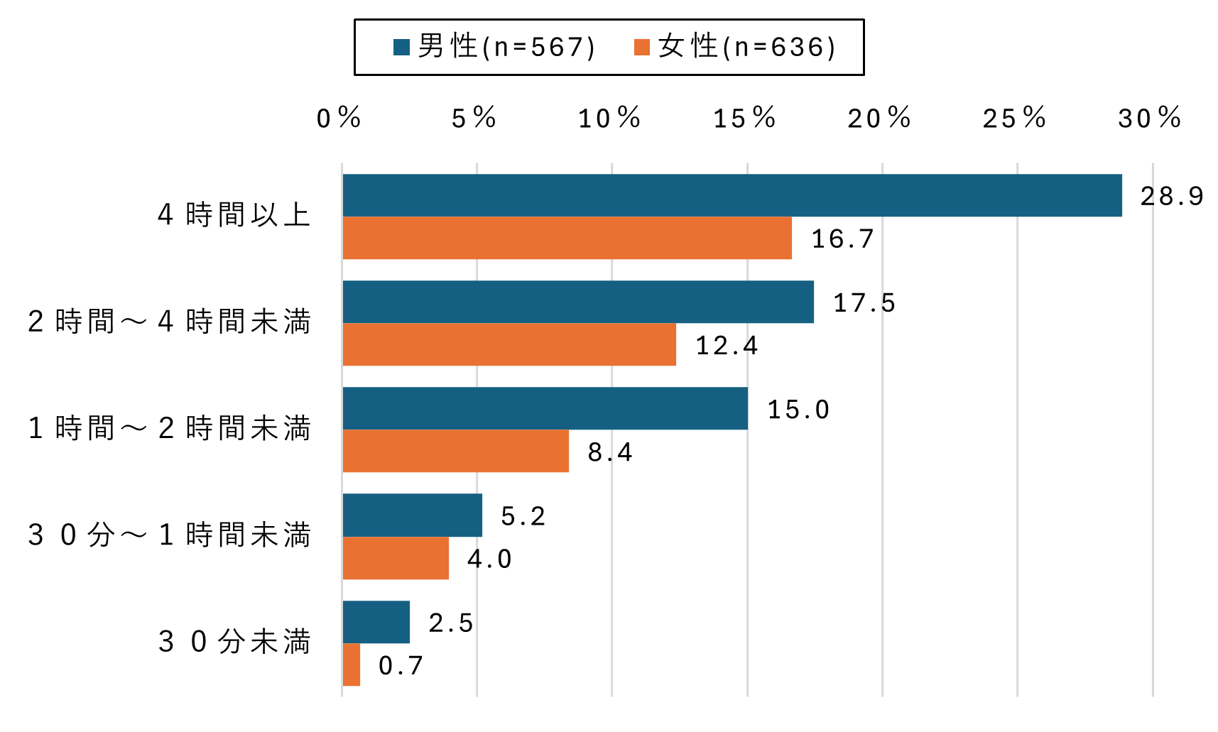 最後に、インターネット上のトラブル経験の有無とインターネット利用時間の関係を分析しました。結果として、利用時間が長いほどトラブル経験率は高い傾向が見られます。特に、男性で1日4時間以上利用する層では、トラブル経験率が顕著に高いことが確認されました。