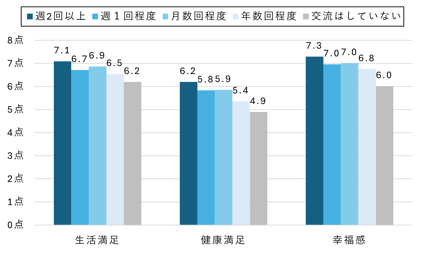 交流頻度とQOLに関連する指標、生活満足度・健康満足度・幸福感(いずれの項目も10点~0点で回答)を合わせみたのが図2となります。交流頻度が多いと点数は高い傾向でした。