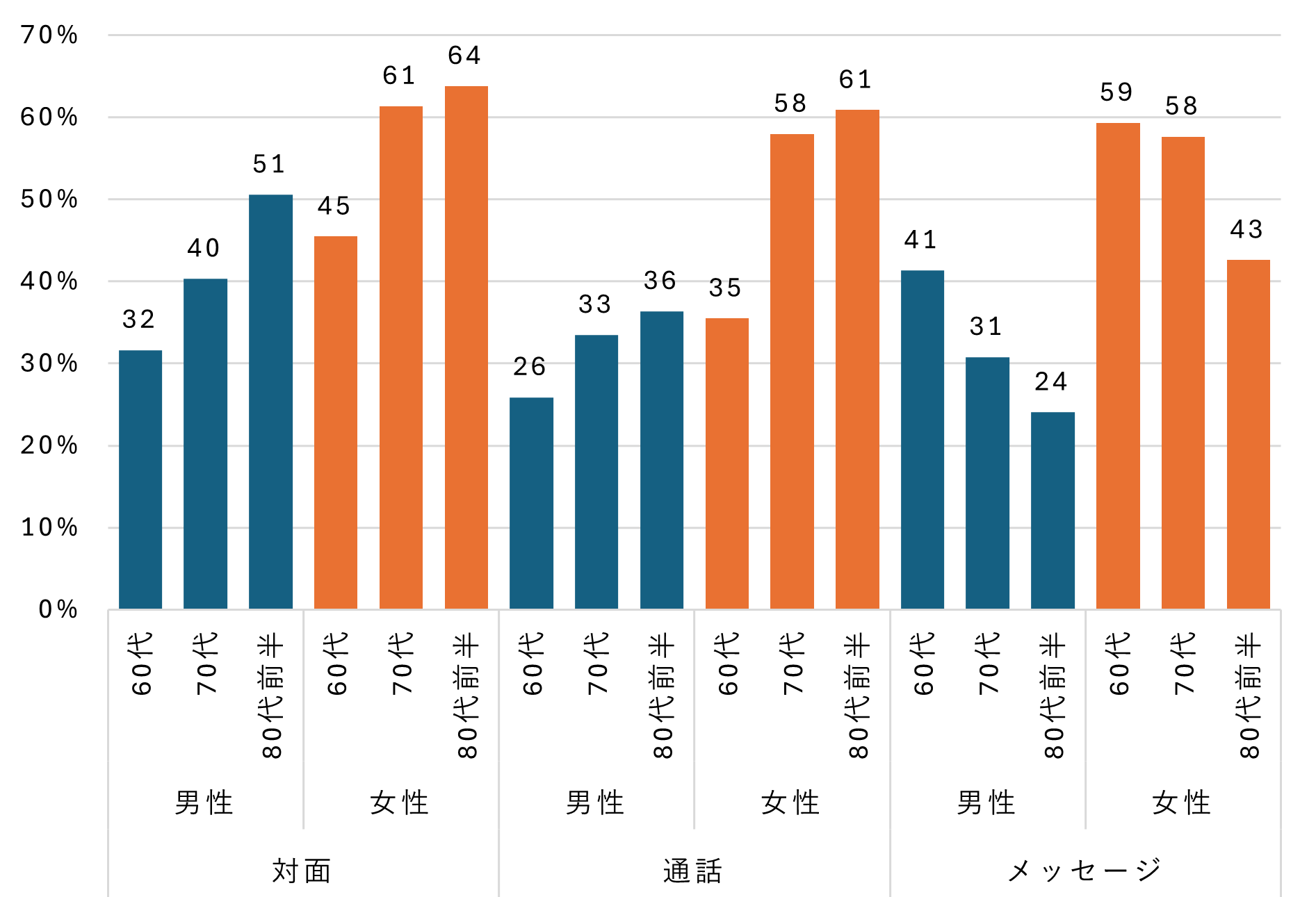 次に、交流の内容を対面、通話、メッセージ(メール・LINEなど)に分けて、それぞれ週1回以上交流を行っている割合を示したのが図3となります。同年代ではいずれも、女性の頻度が多いです。また、対面と通話は年代が上がると多くなりますが、メッセージは年代が上がると、少なくなる傾向でした。