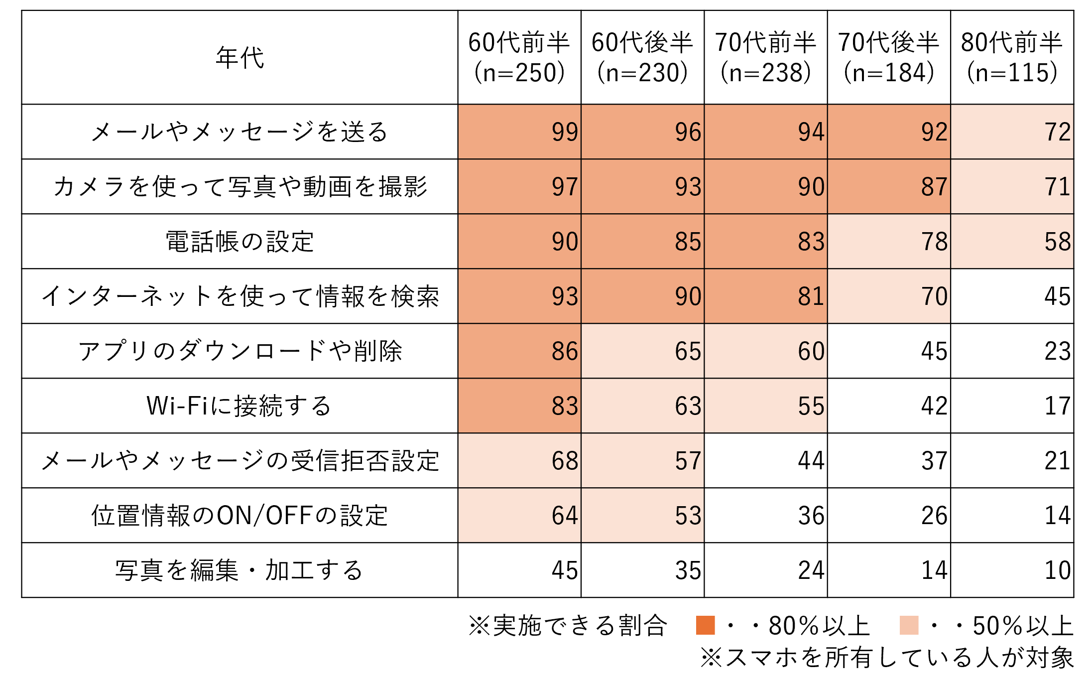 スマートフォンをより活用するために必要とされる「アプリのダウンロードや削除」については、70代前半以下では6割以上が「操作できる」と回答しています。