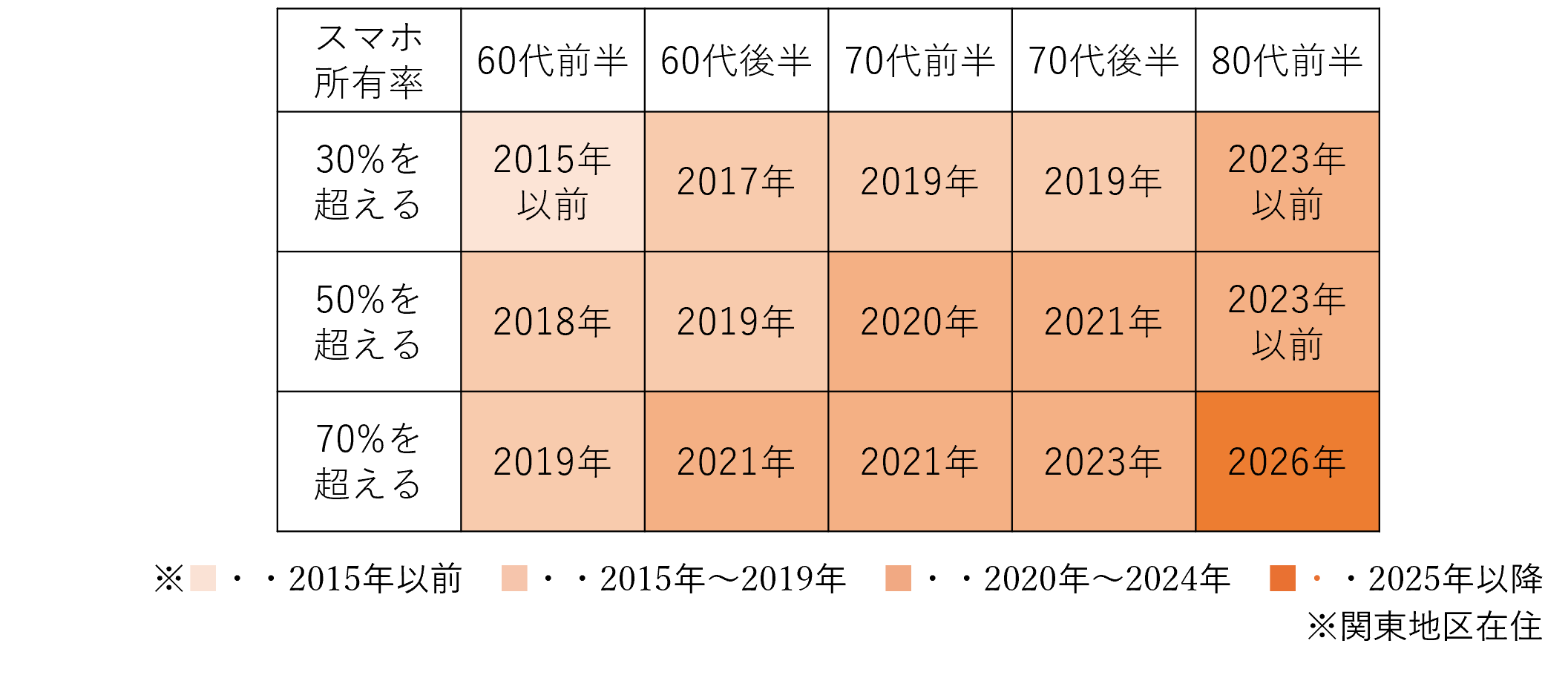 次に、スマートフォンの所有率について、2015年からの経年変化を見ていきます。対象は、比較可能な関東地区在住のシニアとしています(図2、表1)。年代にかかわらず、2015年からの10年間でスマートフォンの所有率が大きく伸びていることが分かります。例えば、70代前半では2018年からの3年間で、40ポイントの大幅な伸びが見られました。